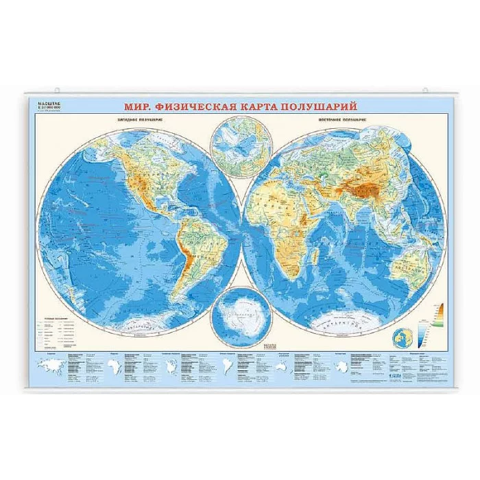 Изучать географию по карте «Мир. Физическая карта полушарий» стало ещё удобнее. У карты оптимальный размер 101х69 см., а то что она закреплена на рейках, значительно упрощает размещение карты на стене. От повреждений и выцветания карта защищена ламинацией.