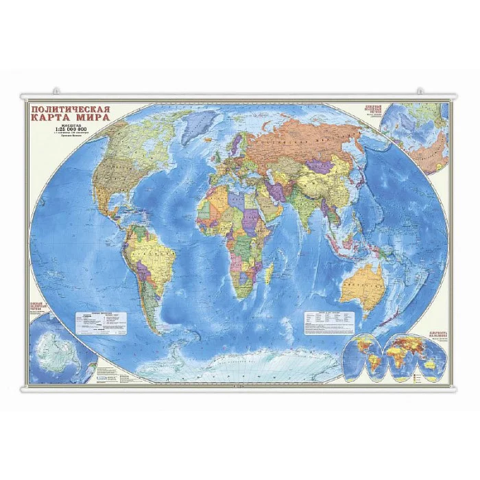 На политической карте мира подробно отражено современное политико-административное устройство мира, даны границы государств. Территории государств выделены цветом. Населённые пункты отображены по числу жителей и административному значению, показаны основные наземные пути сообщения и судоходные каналы. Особенность данной карты в том, что на ней, помимо геополитической информации, размещена символика государств мира. Государственные флаги стран мира сгруппированы по каждому континенту.Картазакреплена на рейках, что значительно упрощает ее размещениена стене. От повреждений и выцветания карта защищена ламинацией.
