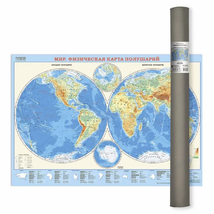 Карта настенная в тубусе. Мир. Физическая карта полушарий. М1:37 млн. 101х69 см. ЛАМ ГЕОДОМ