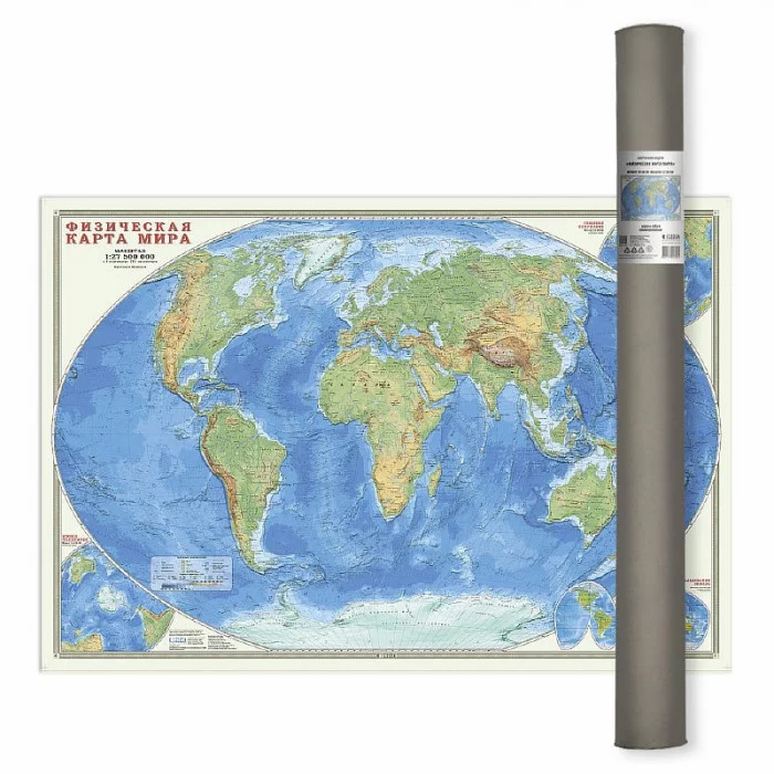 Карта настенная в тубусе. Мир Физический. М1:27, 5 млн. 101х69 см. ЛАМ ГЕОДОМ