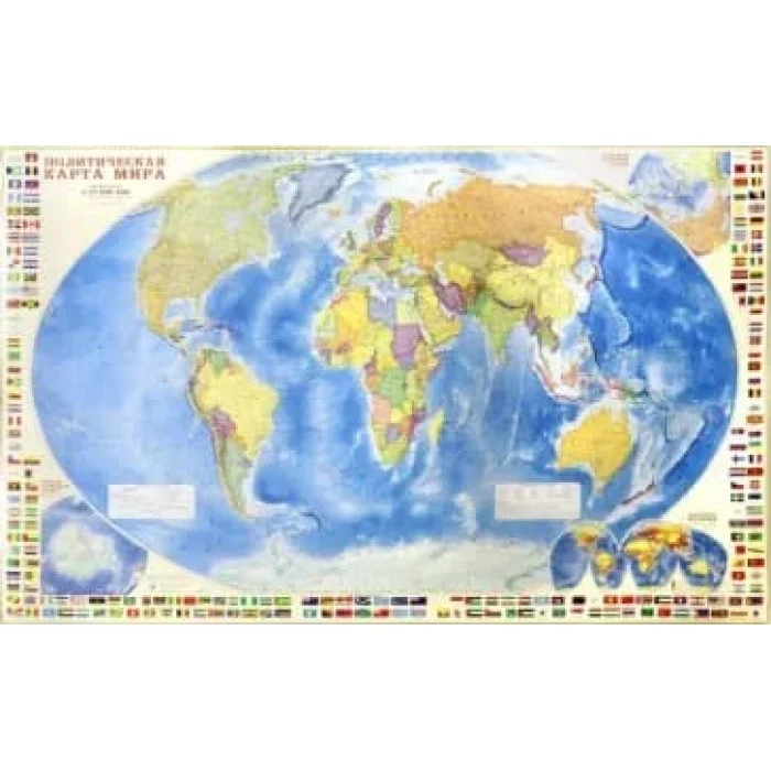 Карта политического мира подробно отражает современное политико-административное устройство мира и границы государств. Территории государств выделены цветом. Населённые пункты отображены по числу жителей и административному значению, показаны основные наземные пути сообщения и судоходные каналы. Особенность данной карты в том, что на ней, помимо геополитической информации, размещена символика государств мира. Государственные флаги стран мира сгруппированы по каждому континенту.