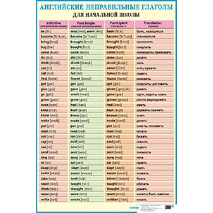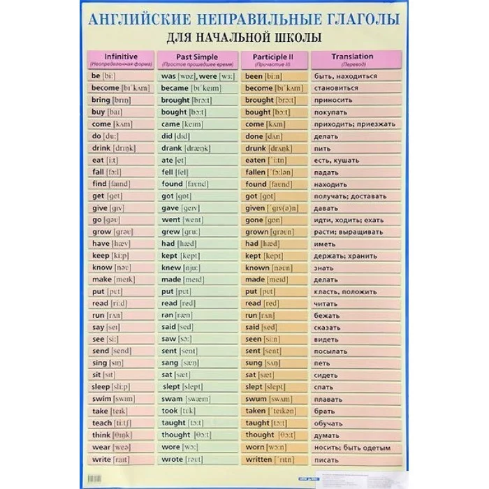 На плакате представлены неправильные глаголы английского языка в соответствии с программой начальной школы.
