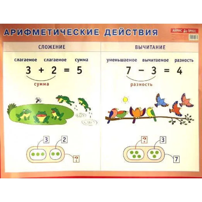 На плакате представлены арифметические действия сложение и вычитание.