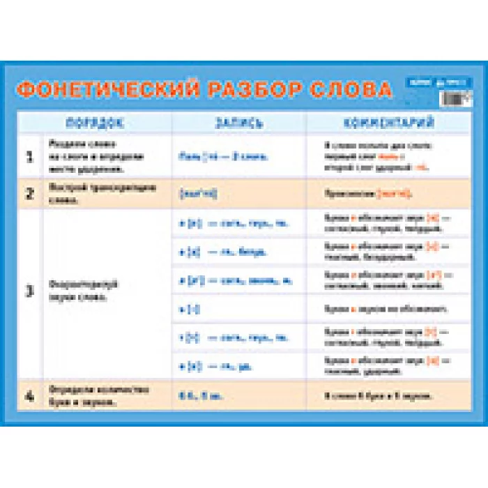 На красочно оформленном плакате представлена таблица фонетического разбора слова, которая включает не только порядок (алгоритм) разбора слова и его запись, но и устный комментарий. Комментарий в структуре фонетического разбора, транскрипция слова существенно повышают функциональность и эффективность таблицы, как наглядного средства.