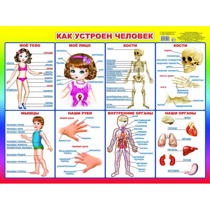 Плакат для детей дошкольного возраста 4-7 лет, 440*590 мм. Постер поможет ребёнку узнать о своём теле много нового и интересного. Для родителей - прекрасная возможность подготовить ребенка к школе. Плакат можно разместить на стене комнаты, в классе школы, в группе детского сада. Развивает зрительное, слуховое восприятие, логическое мышление и память.