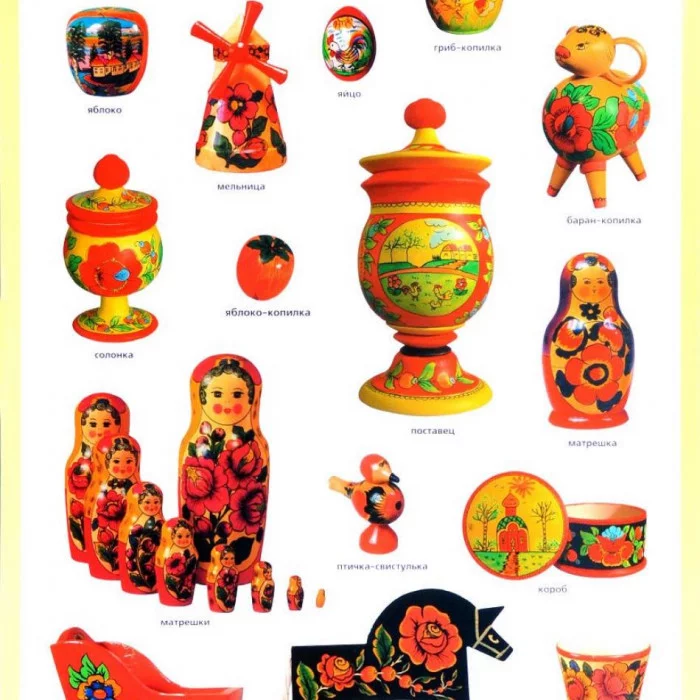 Работы современных мастеров» дает возможность познакомить детей с одним из красивейших народных промыслов. Изображения готовых работ помогут детям получить наглядное представление о цветовой гамме, орнаментах, узорах, форме, а также об основных сюжетах полхов-майданской росписи.