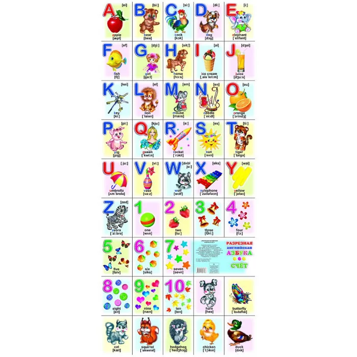Обучающий плакат для детей "Азбука и Счёт". Настоящее издание представляет собой плакат с английским алфавитом и цифрами, которые сопровождают яркие красочные иллюстрации. Занимательный, полезный разрезной постер в большом формате, обязательно станет украшением детской комнаты, затем его можно превратить в самый настоящий набор карточек, и процесс обучения превратится в увлекательную игру. Слова-подписи под картинками представлены с транскрипцией. Первые уроки знакомства с буквами, обогащают словарный запас, развивают речь, память, воображение. Замечательный красочный плакат поможет ребёнку познакомиться с буквами, научиться читать и считать на английском языке.