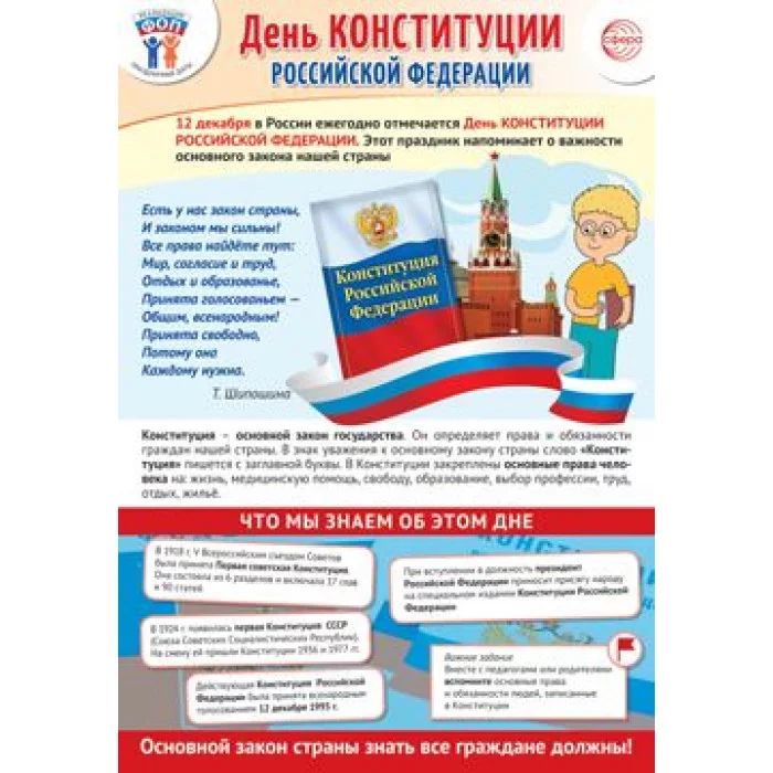Плакат посвящён Дню Конституции Российской Федерации, который ежегодно отмечается 12 декабря. Познакомит с историей появления основного закона страны, в котором записаны права и обязанности граждан. В стихотворении говорится, что Конституция была принята общим народным голосованием, и в ней записаны права человека. В разделе «Что мы знаем об этом дне» представлена необходимая информация Плакат хорошо иллюстрирован, имеет удобный формат А3 и послужит прекрасным дополнением к истории праздника. Может использоваться в образовательном процессе в дошкольных организациях и школах, на викторинах и тематических занятиях, посвящённых символике и истории нашей страны.
