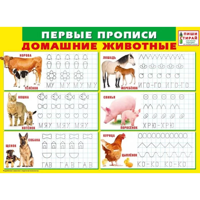 Плакат а4 "Первые прописи. Домашние животные" (Пиши-стирай) 70891