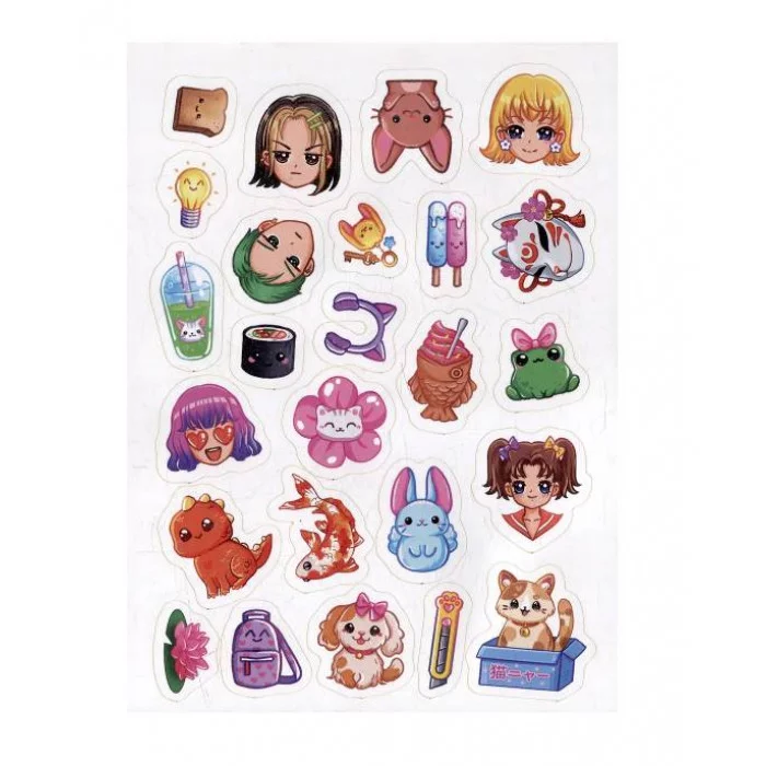 Наклейки с героями в стиле аниме порадуют заядлых анимешников. Стикеры собраны в брошюру на скрепке, поэтому их удобно хранить и брать с собой. Наклейки легко отклеиваются от своей основы, благодаря чему ими может пользоваться даже маленький ребёнок. Симпатичными наклейками можно украсить холодильник, личный дневник, тетрадь, анкету для друзей и любую другую поверхность!