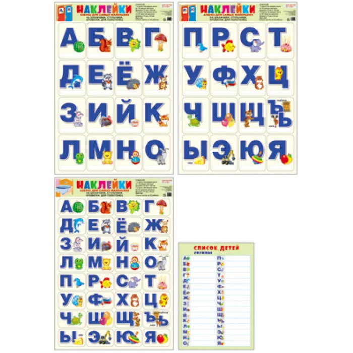 Наклейки на шкафчики, кроватки и стульчики. Азбука для самых маленьких. 4 листа А3 + А4 список 32