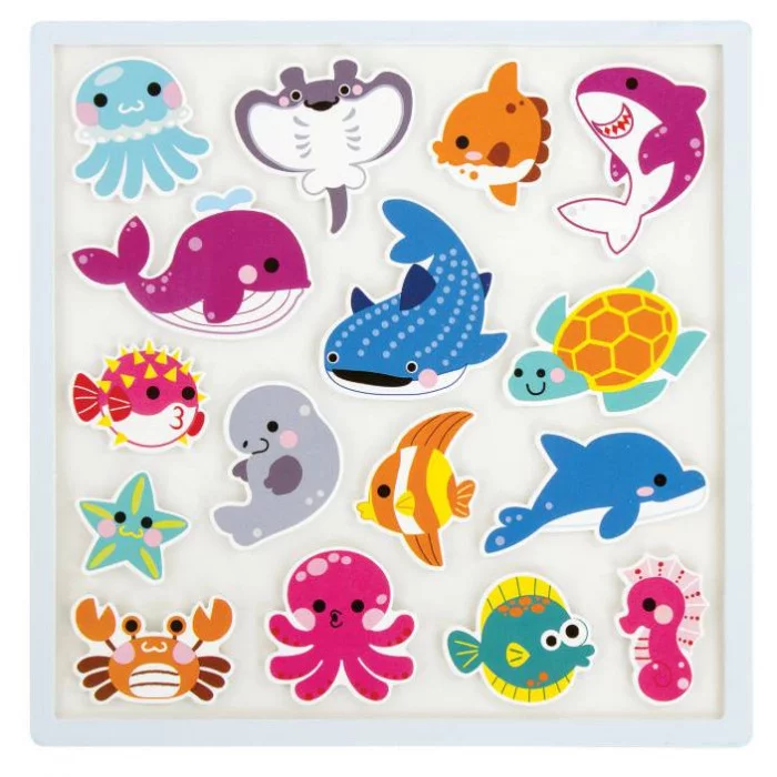 В набор входит 16 крупных объемных наклеек в виде различных морских обитателей, а также картонное поле размером 20*40 см (поставляется в сложенном виде) с определенными местами для нанесения наклеек. Место для каждой наклейки на поле подписано соответствующим образом, например, кит, медуза, дельфин и т.д. Таким образом, в ходе игры ребенок знакомится с названием и внешним видом животного.
