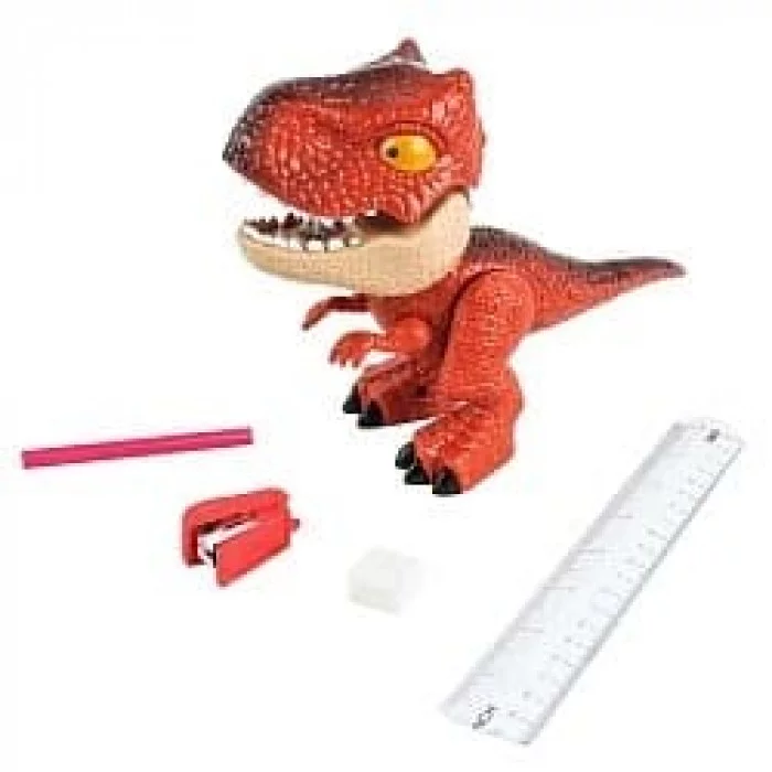 Набор настольный детский 5 в 1 в виде динозавра, цвет красный. Оригинальный дизайн настольного набора отлично впишется в интерьер детской комнаты. Подвижные части у динозавра: лапы (верхние, нижние), челюсть. Размер динозавра - 8,5*14см. В наборе: игрушка динозавр, чернографитный карандаш НВ (твердо-мягкий), точилка, ластик, мини-степлер, гибкая линейка-браслет 20см.