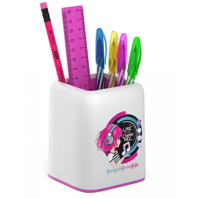 Готовый набор с наполнением. Стильная подставка изготовлена из высококачественного пластика. В комплекте 6 предметов: 4 ручки, карандаш, линейка. Наполнение может отличаться от представленного.