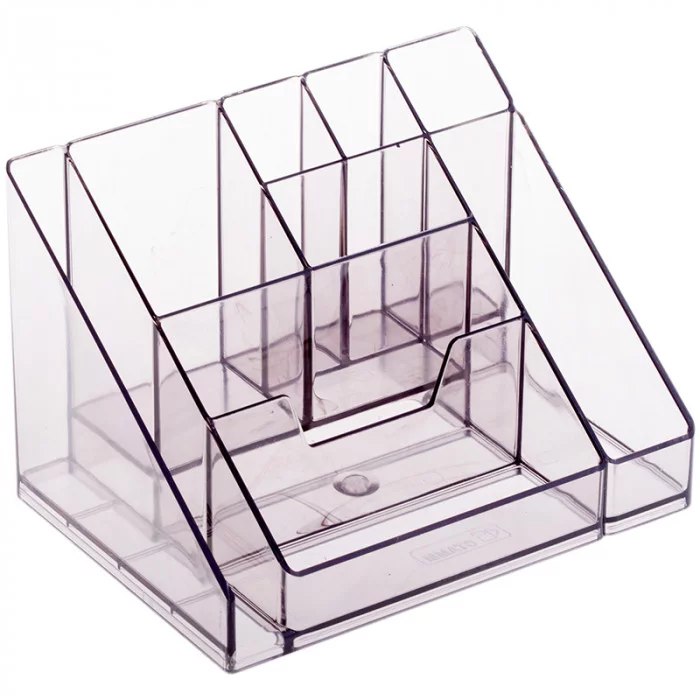 Настольная подставка "СТАММ" серии "Каскад" предназначена для хранения канцелярских принадлежностей. Удачное сочетание вместительности и компактности размеров. Прочный корпус, гладкая глянцевая поверхность. Девять отделений позволяют хранить множество канцелярских мелочей и пишущих принадлежностей. Изделие высотой 10,3 см, основанием 15,8*11,5 см выполнено из качественного пластика. Цвет - тонированный черный.