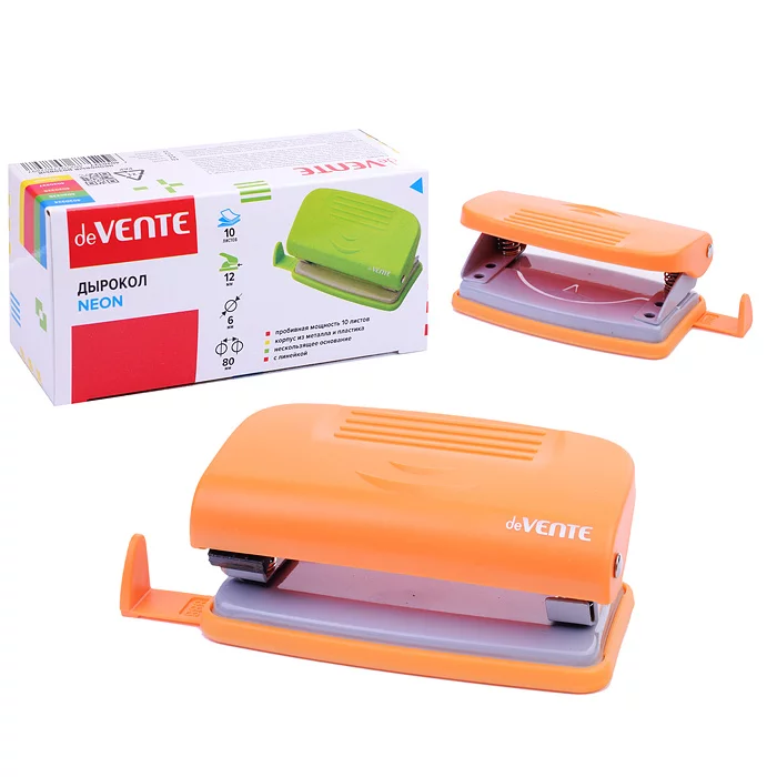 Дырокол "Neon" (10 листов) пластиковый с линейкой, в картонной коробке, неоновый оранжевый 4020326