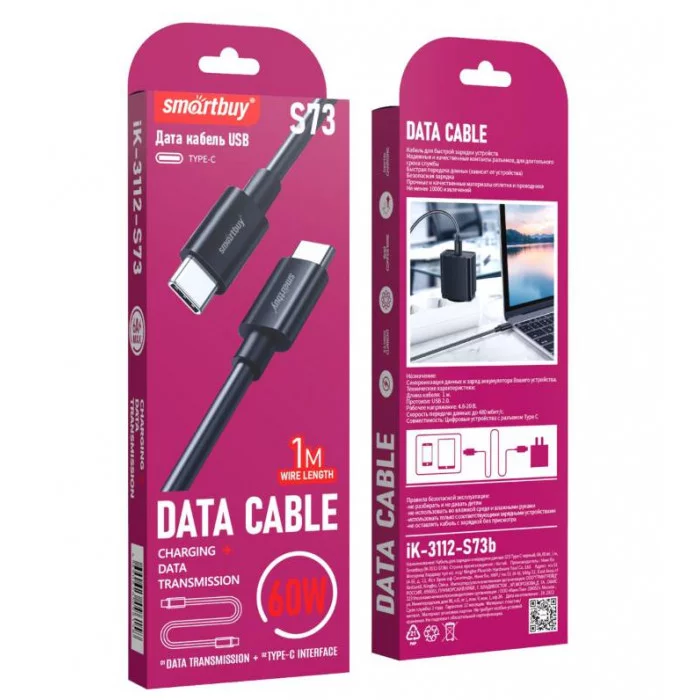 Кабель Smartbuy S73, Type-C - Type-C, 6A, 60 вт output, 1м, черный 376311