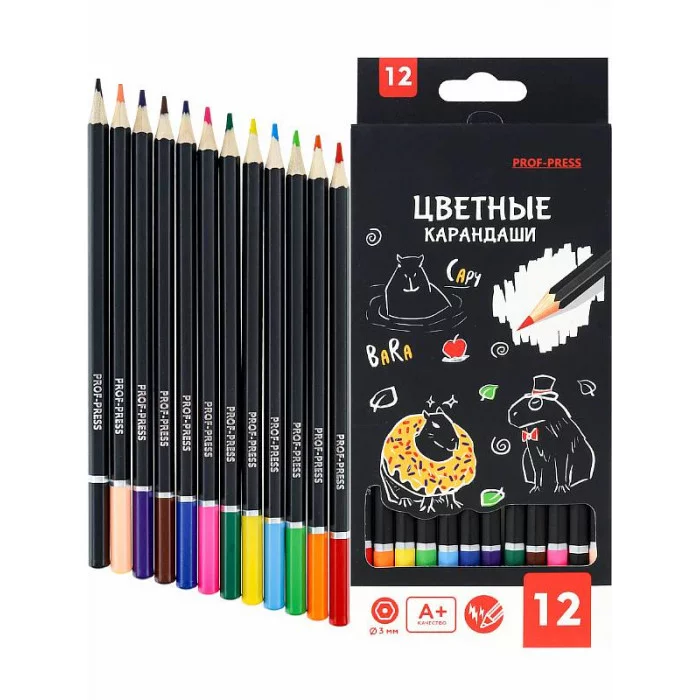 Цветные карандаши — это друзья детства каждого ребенка! Они не только помогают развитию мелкой моторики, но и способствуют выражению своих эмоций через рисунок! Яркие насыщенные цвета и качество — всё, что нужно для красивого рисунка и хорошего настроения! Цветные карандаши от компании "Проф-Пресс" представлены в наборе из 12 цветов и изготовлены в деревянном шестигранном корпусе. Твёрдость: 2М. Диаметр: 3мм. Продаются в картонной коробке с европодвесом.