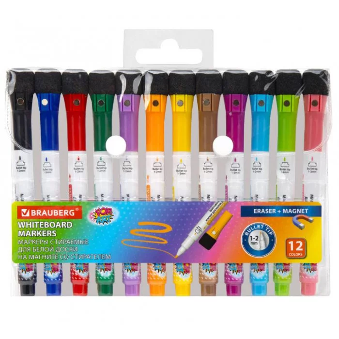 Маркеры на магните со стирателем для белой доски и планера, 12 цветов, BRAUBERG POP-ART, 1-2 мм, 152568