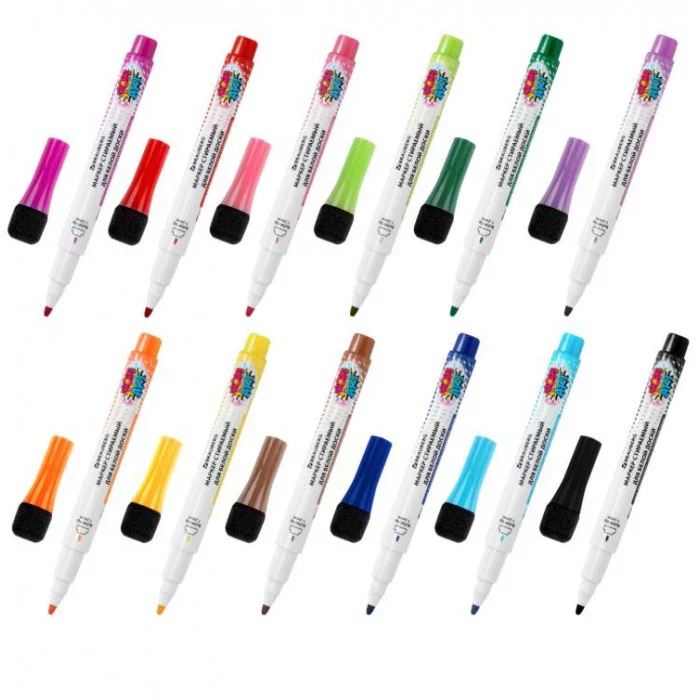 Колпачок маркера оснащен магнитом, что делает его удобным в использовании и позволяет крепить маркер прямо на доске, планере или любом другом магнитном рабочем месте. Кроме того, в колпачке имеется удобная губка-стиратель для удаления записей.