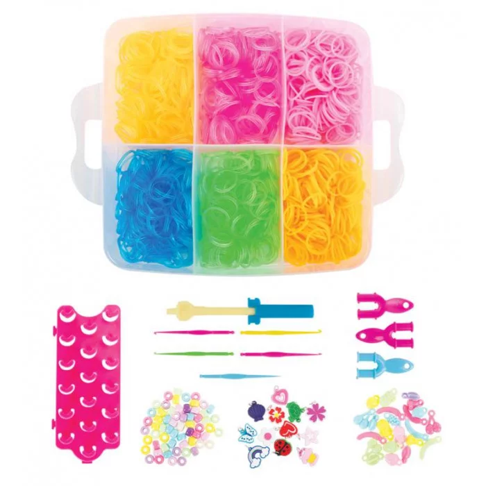 - Комплектация:резинки для плетения 3000шт, крючки 8 шт, карабины 4шт, S-клипсы 300шт, станок для плетения 1шт, бусины 180шт, подвески 32шт, инструкция 1шт