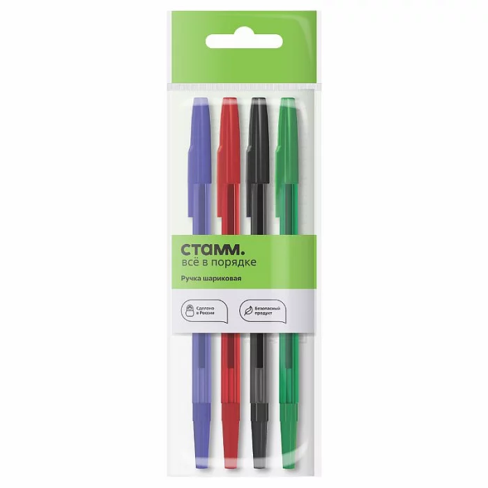 Набор шариковых ручек СТАММ "049" 4шт., 04цв., 7мм, тонированный корпус, пакет с европодвесом 346489