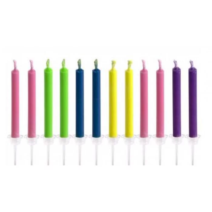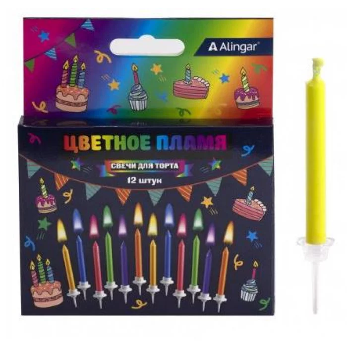 Набор свечей для торта с цветным пламенем Alingar, 6 см, 12 шт., с подставками, ассорти, коробка с европодвесом AL11253