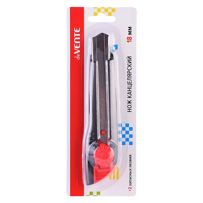 Нож канцелярский 18 мм, c 2-мя запасными лезвиями, металлические направляющие, ручная блокировка лезвия, картонный блистер, черный с красным 4090401