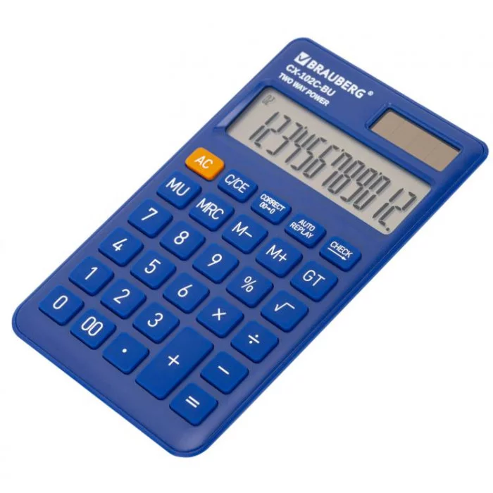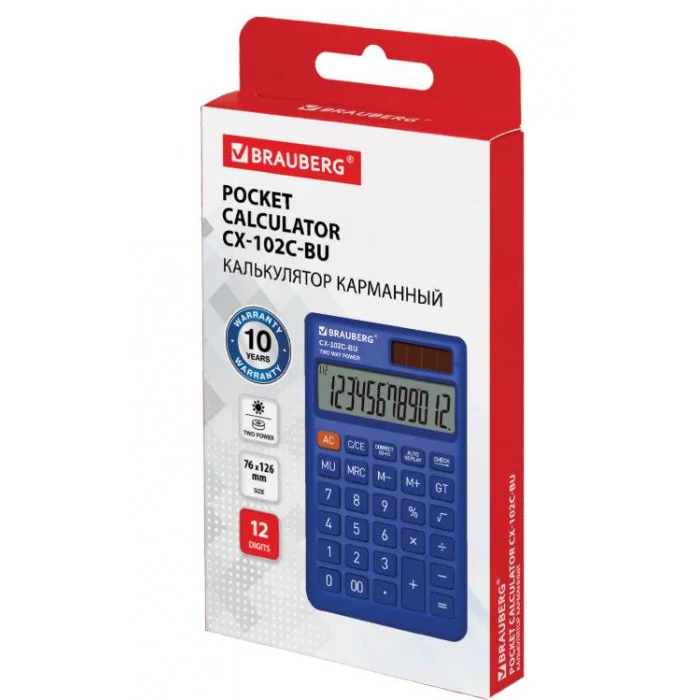Калькулятор карманный BRAUBERG CX-102C-BU (76x126 мм), 12 разрядов, двойное питание, СИНИЙ, 272648
