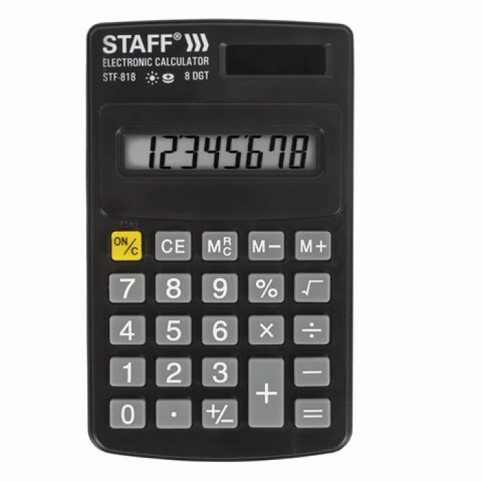 Простой и надежный карманный калькулятор STAFF STF-818 поможет выполнить базовые вычисления везде, где Вам понадобится. Калькулятор легко помещается в карман и удобно лежит в руке. Калькулятор производит все основные арифметические действия, вычисления с памятью, вычисления с процентами, извлечение квадратного корня и возведение в степень. Встроенный аккумулятор и солнечная батарея, образующие единую схему питания калькулятора, позволяют устройству работать при любом освещении. Практичный чехол из ПВХ защищает калькулятор от грязи и случайного включения. Имеет компактные размеры - 102х62 мм.