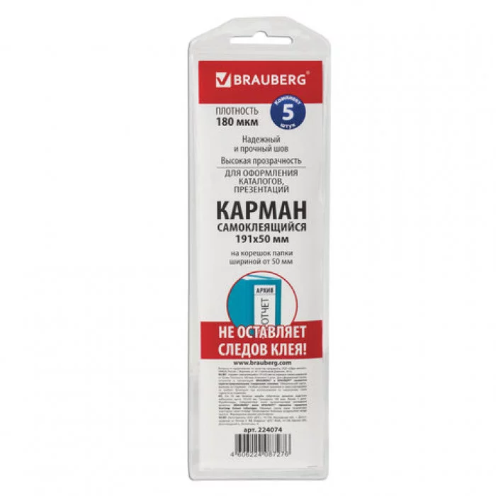 Самоклеящеся карманы BRAUBERG предназначены для нанесения информации на папки, размещения объявлений, меню и т.д. Выполнены из прочного ПВХ плотностью 180 микрон и имеют гладкую фактуру и прочный шов. Клейкий, прозрачный слой позволяет разместить карманы на любых гладких поверхностях, при переклеивании не оставляет следов. Размер кармана - 191х50 мм. 5 штук в комплекте. Назначение: для папок. Фактура: матовая. Количество в упаковке: 5 шт.. Толщина: 180 мкм. Не оставляют следов клея: да. Серия: Standard. Прозрачные: да. Материал: прочный ПВХ. Длина: 191 мм. Ширина: 50 мм. Тип упаковки: пакет с европодвесом Бренд - BRAUBERG. Производитель - Россия. Артикул - 224074. Штрихкод - 4606224087276