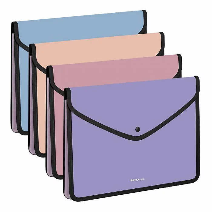 Папка-конверт на кнопке формата А4 из высококачественного пластика с текстурой поверхности "софт-тач", на которой не видно отпечатков пальцев и мелких царапин, с элементами 100% полиэстера. Предназначена для хранения и транспортировки документов и тетрадей формата А4.Имеет одно отделение с расширением из ткани. Цвет папки - ассорти: бежевый, голубой, розовый, фиолетовый. Цвет вставки - светло-розовый. Размер - 370x280x50мм, толщина - 0.6мм. Код и баркод на каждой единице товара.