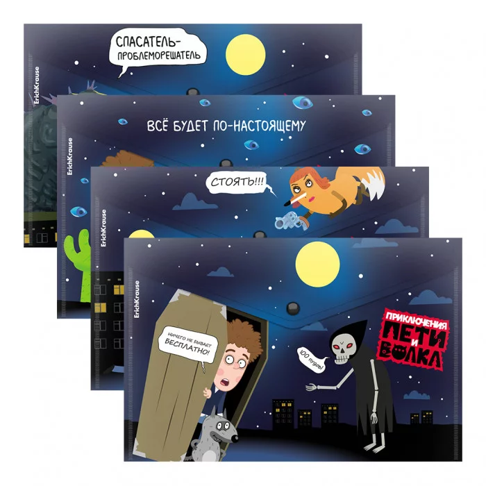 Папка-конверт на кнопке пластиковая ErichKrause Приключения Пети и Волка, A4, ассорти 61154
