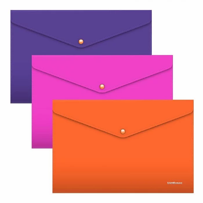 Папка-конверт на кнопке формата А4 из высококачественного непрозрачного пластика с текстурой поверхности "софт-тач", на которой не видно отпечатков пальцев и мелких царапин. Предназначена для хранения и транспортировки небольшого количества документов. Цвет папки - ассорти: маджента, оранжевый, фиолетовый. Надежная застежка-кнопка обеспечивает быстрый доступ к документам. Папка вмещает до 120 бумажных листов. Размер - 232х333мм, толщина - 0.18мм. Код и баркод на каждой единице товара.