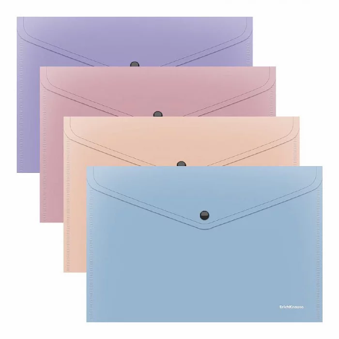 Папка-конверт на кнопке формата А4 из высококачественного непрозрачного пластика с текстурой поверхности "софт-тач", на которой не видно отпечатков пальцев и мелких царапин. Предназначена для хранения и транспортировки небольшого количества документов. Цвет папки - ассорти: бежевый, голубой, розовый, фиолетовый. Надежная застежка-кнопка обеспечивает быстрый доступ к документам. Папка вмещает до 120 бумажных листов. Размер - 232х333мм, толщина - 0.18мм. Код и баркод на каждой единице товара.