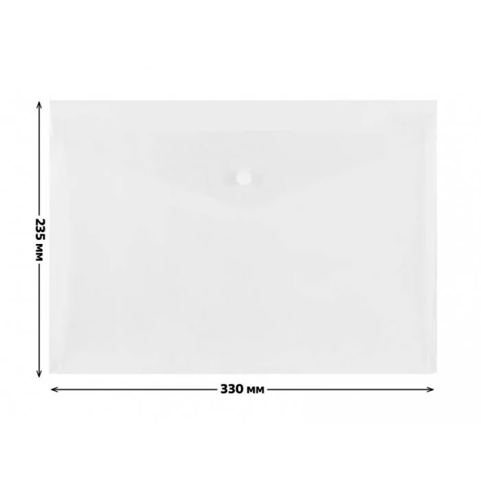 Папка-конверт на кнопке «СТАММ» формата А4 надёжно защищает документы от влаги и пыли. Горизонтальная папка вмещает до 100 листов. Цвет папки – прозрачный бесцветный. Папка изготовлена из качественного полипропилена плотностью 150 мкм с глянцевой текстурой. Размер папки составляет 330*235 мм. Изделие плотно закрывается клапаном с кнопкой. Размер: 330*235 мм; Толщина материала: 150 мкм; Формат: А4; Вместимость в листах: до 100 листов; Цвет: прозрачный бесцветный; Способ фиксации: кнопка.
