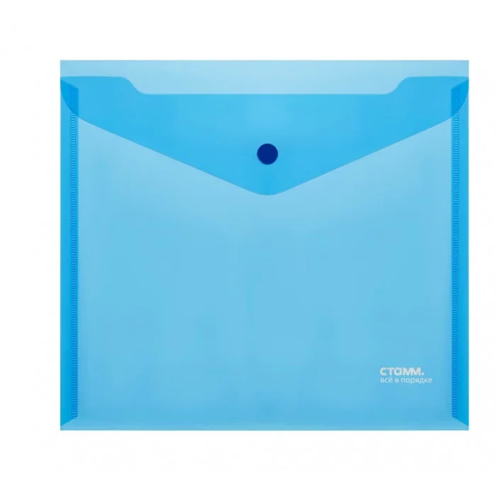 Папка-конверт на кнопке СТАММ А5+, 180мкм, пластик, прозрачная, синяя 356727
