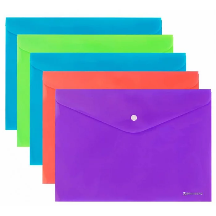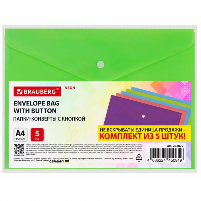 Папка-конверт с кнопкой А4, КОМПЛЕКТ 5 шт., яркие неоновые цвета ассорти, BRAUBERG "NEON", 272872