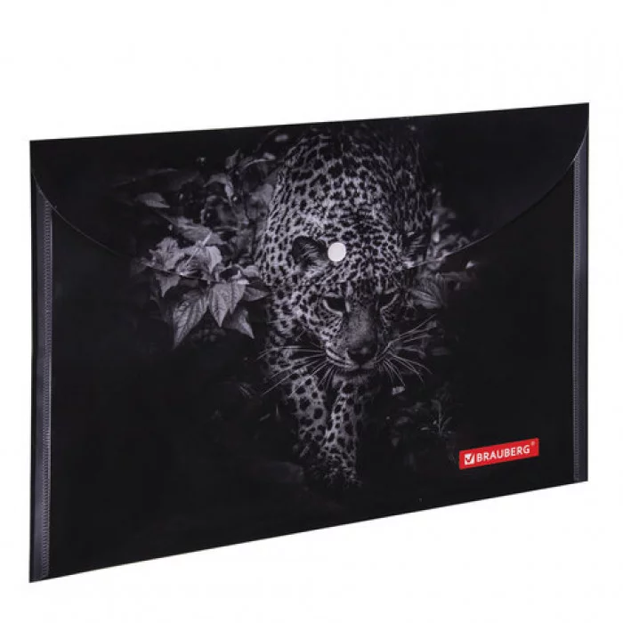 Папка-конверт с кнопкой BRAUBERG "LEOPARD", А4, 160 мкм, до 100 листов, цветная печать, 228039