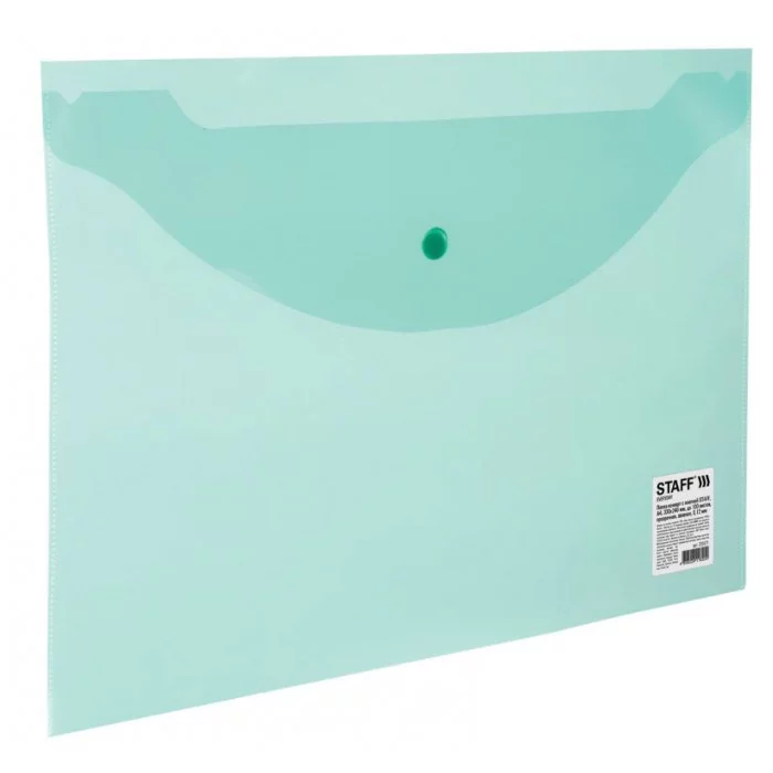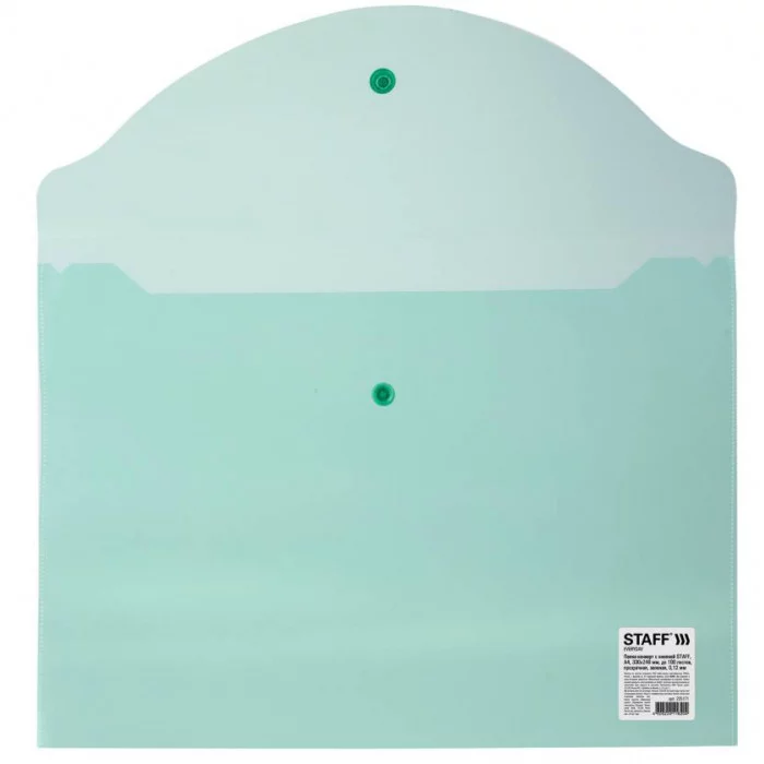 Папка-конверт с кнопкой STAFF, А4, до 100 листов, прозрачная, зеленая, 0,12 мм, 225171