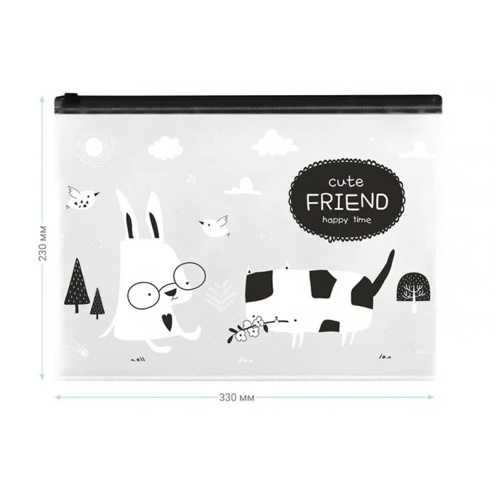 Папка-конверт на молнии MESHU Cute Friend – стильный помощник, который подойдет для хранения тетрадей, блокнотов, ежедневников форматов А4 и А5. Папка формата А4 вмещает до 60 листов стандартной офисной бумаги. Изготовлена из прочного полипропилена толщиной 150 мкм с гладкой фактурой. Размер горизонтальной папки – 330*230 мм. Папка имеет герметичную застежку-зиплок чёрного цвета, которая защищает документы от механических повреждений, пыли и влаги. Милый и стильный чёрно-белый рисунок с животными понравится всем любителям современных дизайнов. Вместимость, в листах: 60; Формат: А4; Цвет: прозрачный с рисунком; Материал: пластик.