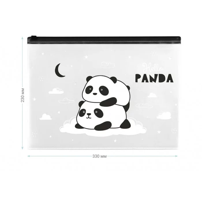 Папка-конверт на молнии MESHU Hello Panda – стильный помощник, который подойдет для хранения тетрадей, блокнотов, ежедневников форматов А4 и А5. Папка формата А4 вмещает до 60 листов стандартной офисной бумаги. Изготовлена из прочного полипропилена толщиной 150 мкм с гладкой фактурой. Размер горизонтальной папки – 330*230 мм. Папка имеет герметичную застежку-зиплок чёрного цвета, которая защищает документы от механических повреждений, пыли и влаги. Милый и стильный чёрно-белый рисунок с пандами понравится всем любителям современных дизайнов. Вместимость, в листах: 60; Формат: А4; Цвет: прозрачный с рисунком; Материал: пластик.