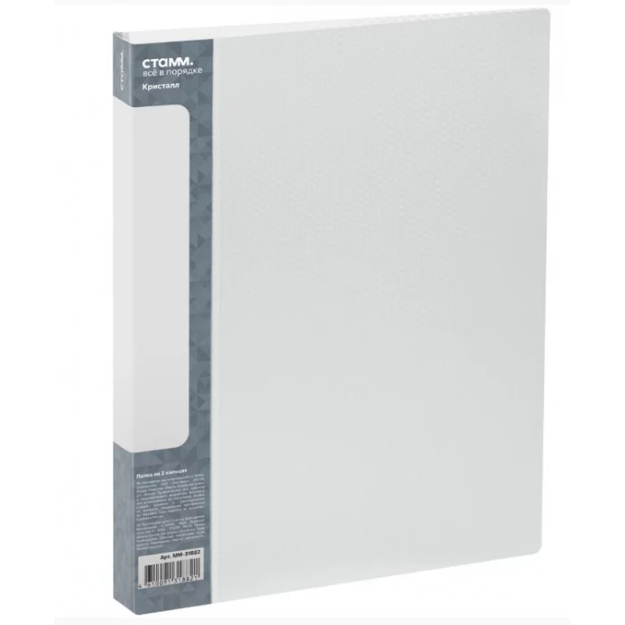 Папка на двух кольцах «СТАММ» серии «Кристалл» предназначена для сшивания и хранения документов формата А4. Изделие выполнено в полупрозрачном бесцветном цвете. Внешняя сторона папки дополнена фактурным паттерном «Кристалл», который защищает изделие от загрязнений и повреждений. Папка изготовлена из качественного полипропилена толщиной 700 мкм. Размер папки — 310*250 мм. Кольцевой механизм, состоящий из двух колец диаметром 16 мм, надёжно держит документы. Ширина корешка — 40 мм, что позволяет вмещать до 120 листов. Папка подходит для хранения как перфорированных документов, так и папок-вкладышей с универсальной перфорацией. На корешке находится карман. Размер: 310*250 мм; Толщина материала: 700 мкм; Формат: А4; Вместимость в листах: до 120 листов; Цвет: бесцветный; Ширина корешка: 40 мм.