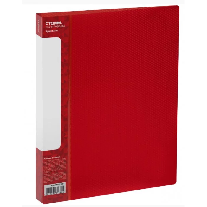 Папка на двух кольцах «СТАММ» серии «Кристалл» предназначена для сшивания и хранения документов формата А4. Изделие выполнено в полупрозрачном красном цвете. Внешняя сторона папки дополнена фактурным паттерном «Кристалл», который защищает изделие от загрязнений и повреждений. Папка изготовлена из качественного полипропилена толщиной 700 мкм. Размер папки — 310*250 мм. Кольцевой механизм, состоящий из двух колец диаметром 16 мм, надёжно держит документы. Ширина корешка — 40 мм, что позволяет вмещать до 120 листов. Папка подходит для хранения как перфорированных документов, так и папок-вкладышей с универсальной перфорацией. На корешке находится карман. Размер: 310*250 мм; Толщина материала: 700 мкм; Формат: А4; Вместимость в листах: до 120 листов; Цвет: красный; Ширина корешка: 40 мм.
