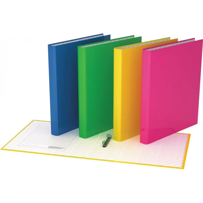 Папка - регистратор формата А4 снабжена механизмом на O-кольцах диаметром 25 мм. Изготовлена из картона толщиной 1,75 мм, покрытого бумагой со структурным тиснением и водоотталкивающей поверхностью. Корешок шириной 35 мм. Вместительность до 250 листов бумаги плотности 80 г/м². На форзаце есть шаблон для оглавления. Удобна для проведения презентаций, представления документации на семинарах. Коллекция представлена в ярких неоновых цветах.