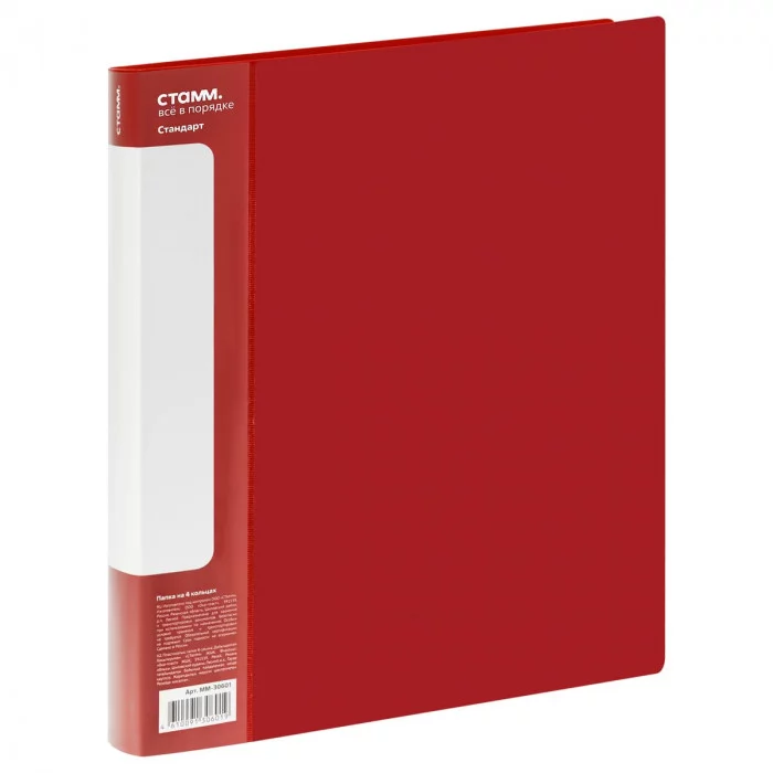 Папка на 4 кольцах «СТАММ» серии «Стандарт» предназначена для хранения перфорированных документов формата А4. Цвет папки – красный. Изготовлена из качественного полипропилена толщиной 700 мкм с текстурой «песок». Размер изделия составляет 310*250 мм. Ширина корешка 25 мм позволяет вмещать в папку до 120 листов. Кольцевой механизм, состоящий из 4 колец диаметром 16 мм, надёжно держит документы. На корешке и внутренней стороне папки имеется карман. Размер: 310*250 мм; Толщина материала: 700 мкм; Формат: А4; Цвет: красный; Вместимость в листах: до 120 листов; Ширина корешка: 25 мм.