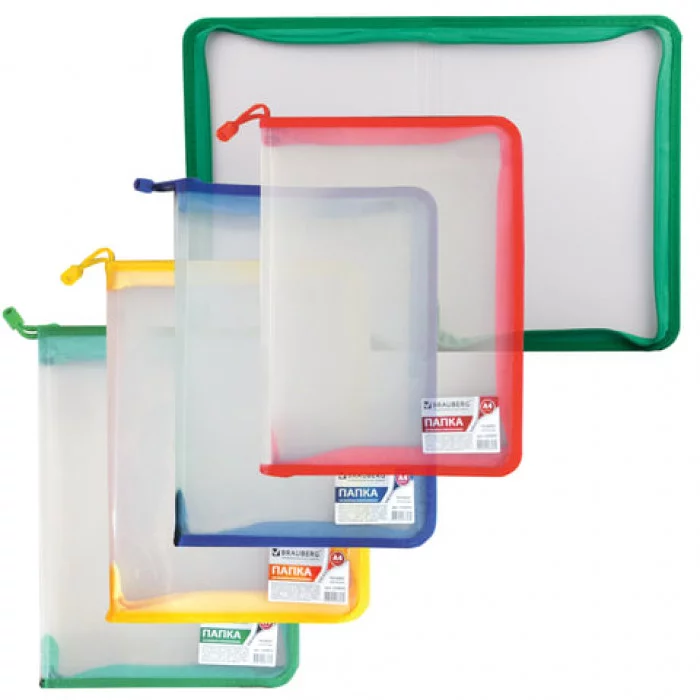 Папка на молнии пластиковая BRAUBERG "Диагональ", А4, 325х230 мм, прозрачная, молния ассорти, 224052