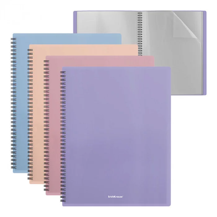 - Папка содержит 20 прозрачных листов-карманов, надежно скрепленных двойной евроспиралью.