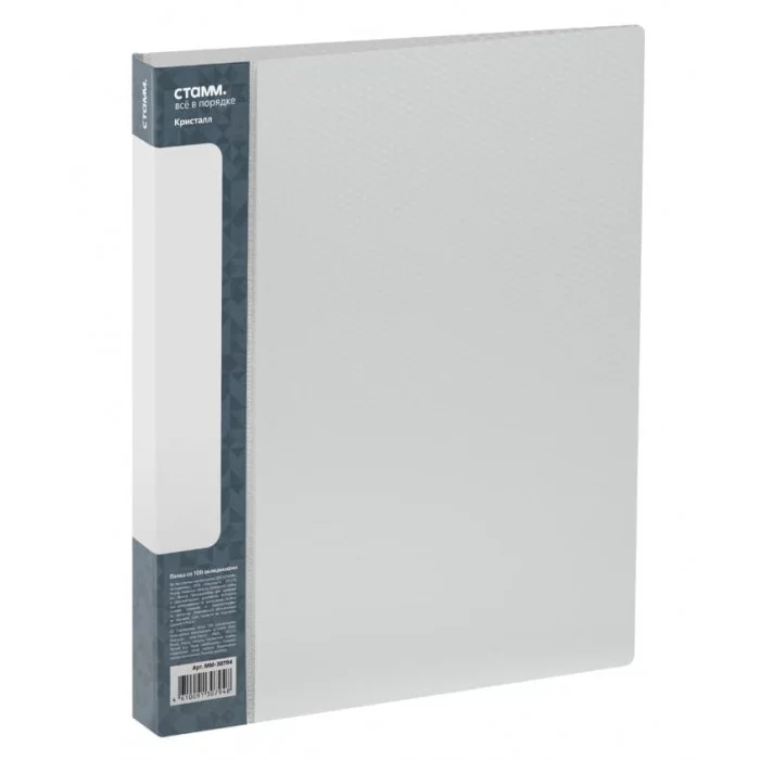 Папка с 100 вкладышами «СТАММ» серии «Кристалл» – отличный помощник для хранения бумаг формата А4. Изделие выполнено в полупрозрачном цвете. Внешняя сторона папки дополнена фактурным паттерном «Кристалл», сохраняющим внешний вид изделия от загрязнений и повреждений. Размер изделия составляет 310*235 мм. Ширина корешка – 30 мм. Тип скрепления – термосварка. Бумагам, вложенным в папку, не требуется перфорация дыроколом. На корешке папки есть удобный карман. Размер: 310*235 мм; Толщина материала: 800 мкм; Формат: А4; Количество вкладышей: 100; Цвет: бесцветный; Тип скрепления: термосварка; Ширина корешка: 30 мм.