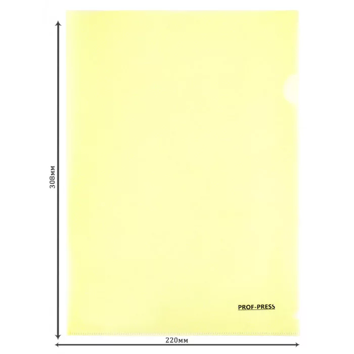 Папка-уголок формата А4 и толщиной 180 мкм предназначена для хранения и удобной транспортировки документов, защищая их от загрязнения и смятия. Специальная выемка предусмотрена для удобного и оперативного извлечение листов из папки. Изделие имеет вертикальную ориентацию. Размер: 220х308 мм. Цвет: жёлтый.